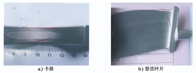 分别对 TC2卡箍和整流叶片进行显微硬度测 试和能谱分析,结果如表1所示,可见 TC2卡箍和 整流叶片亮条缺陷处与周围正常区域的显微硬度测 试结果和能谱分析结果没有明显差异,因此可以判 定 TC2卡箍和整流叶片的亮条缺陷均为锻造过程 中产生的应变线。