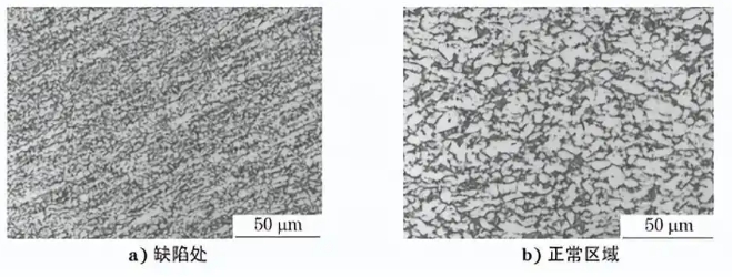采用电子探针对 TC2低压进气导向叶片亮条 缺陷处和周围正常区域进行成分分析,发现缺陷处 钛元 素 质 量 分 数 为 94.50%,铝 元 素 质 量 分 数 为 4.67%,而 周 围 正 常 区 域 的 钛 元 素 质 量 分 数 为 91.66%,铝元素质量分数为4.83%,判断亮条缺陷 属于富钛偏析。这种缺陷的形成与原材料的冶炼过 程有关,在合金熔炼时,合金元素扩散不充分,局部 形成富集或贫化,导致元素偏析。改进原材料的冶 炼工艺可以避免产生这种偏析缺陷。