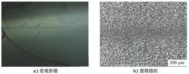 TC6锻造叶片经机械加工后进行金相检验,发 现零件表面存在暗条缺陷,其宏观及显微组织形貌 如图7所示,可见暗条缺陷处初生α相含量明显低 于周围正常区域。