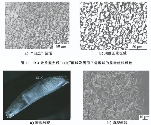 某批次 TC6叶片在抛光后发现“白斑”形貌(见 图10)。对“白斑”区域和周围正常区域进行金相检 验,结果如图11所示。由图11可知,“白斑”区域和 周围正常区域均为等轴组织。