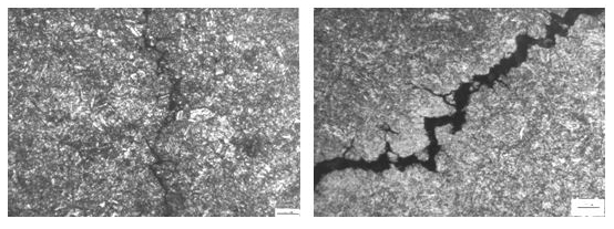 两种规格螺栓沿头部沿轴线切割,制样后进行金相组织检验。 M36和M42螺栓裂纹外侧的金相组织和裂纹形态基本相同。 裂纹从表面延伸到内部,但有些裂纹没有穿透表面; 螺栓表面有浅层全脱碳,裂纹开口处也有脱层现象。 对于碳,闭合裂纹两侧均未发现脱碳现象,如图14-25和图14-26所示。